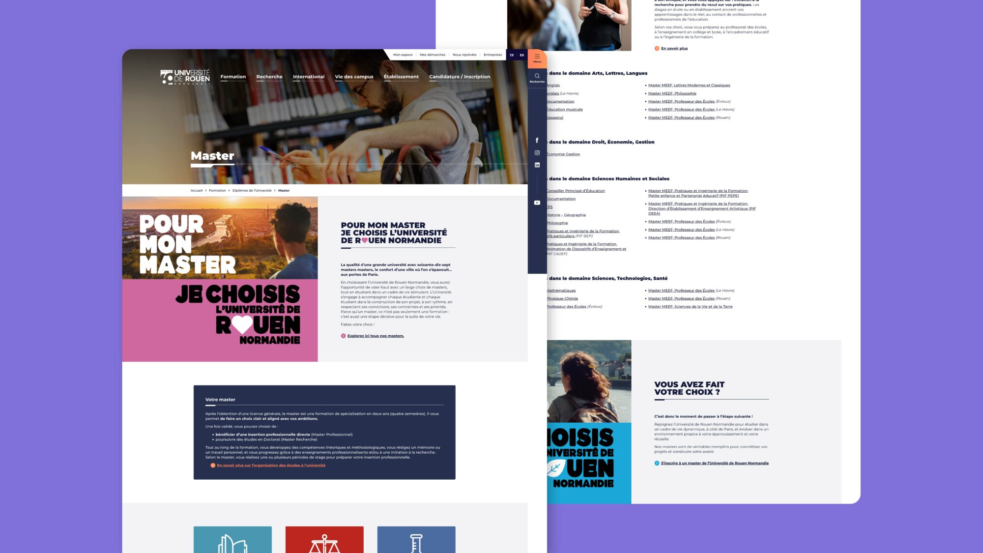 Afin de prolonger l’impact de la campagne et de transformer l’intérêt suscité en passage à l’action, Campus Com a recommandé la mise en place d’une page dédiée aux masters. Notre équipe en a conçu le webdesign afin de proposer une expérience claire et cohérente avec la campagne, tout en facilitant l’accès aux informations sur les formations et les modalités de candidature.
